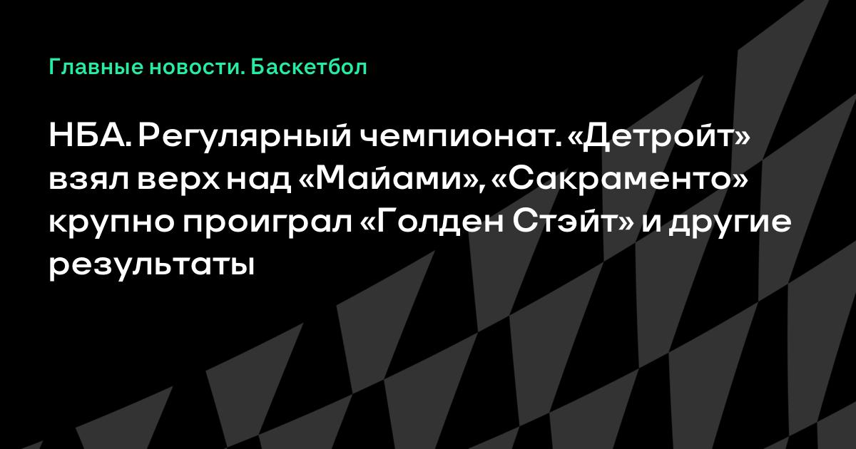 НБА. Регулярный чемпионат. «Детройт» взял верх над «Майами», «Сакраменто» крупно проиграл «Голден Стэйт» и другие результаты Сегодня в регулярном чемпионате НБА прошли пять матчей. «Детройт» продолжил борьбу за попадание плей-офф во встрече с финалистом минувшего сезона «Хит» (108:91). «Сакраменто» крупно уступил лидеру розыгрыша «Голден Стэйт» (96:121).