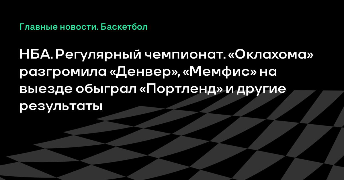 НБА. Регулярный чемпионат. «Оклахома» разгромила «Денвер», «Мемфис» на выезде обыграл «Портленд» и другие результаты Сегодня в рамках регулярного чемпионата НБА прошли девять матчей. «Оклахома» на своей площадке крупно обыграла «Денвер» (119:94). «Портленд» дома уступил «Мемфису» (92:98).