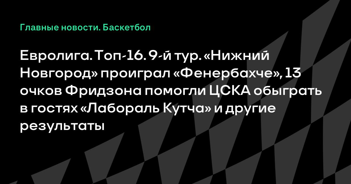 Евролига. Топ-16. 9-й тур. «Нижний Новгород» проиграл «Фенербахче», 13 очков Фридзона помогли ЦСКА обыграть в гостях «Лабораль Кутча» и другие результаты