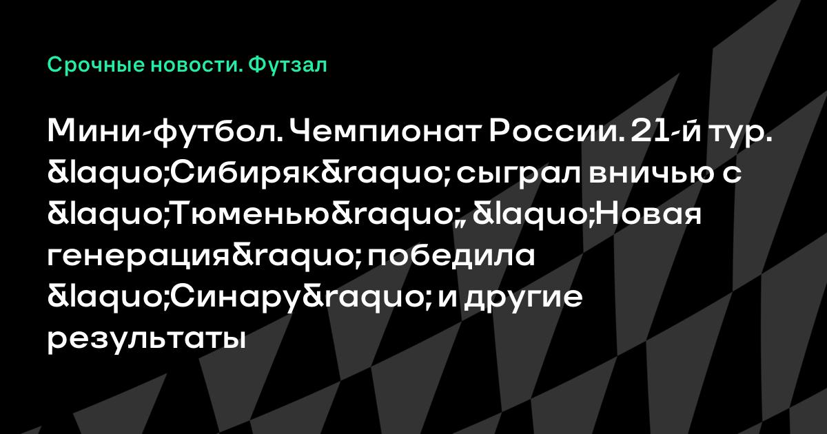 Сегодня прошли матчи 21-го тура чемпионата России по мини-футболу. «Сибиряк» сыграл вничью с «Тюменью» (3:3), «Новая генерация» победила «Синару» (4:1).