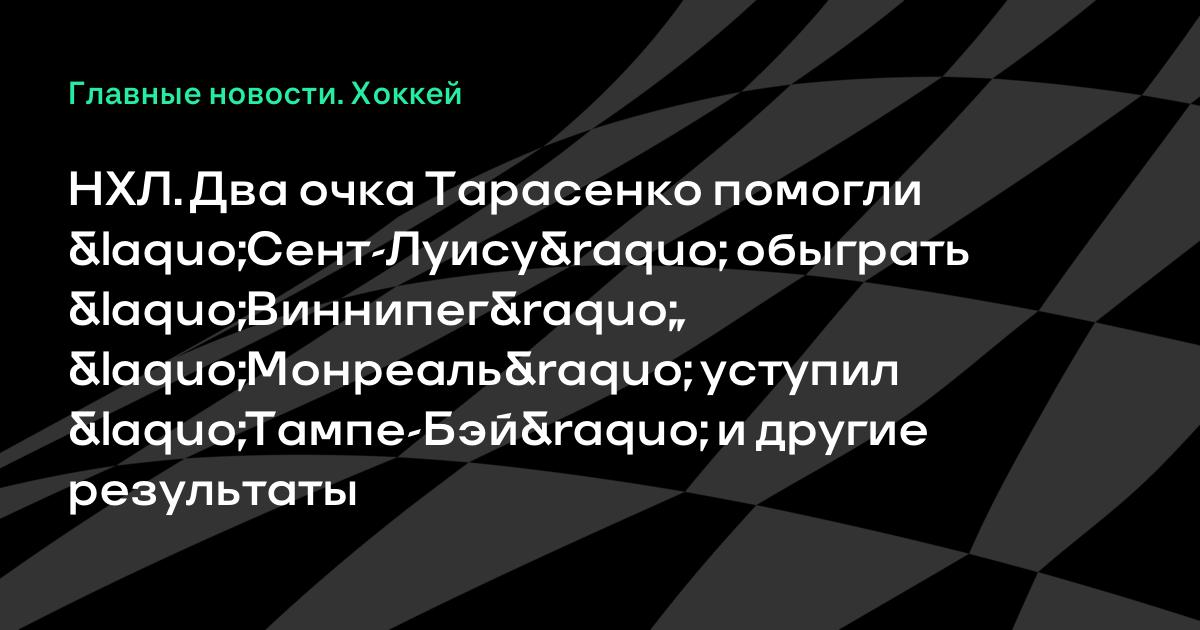 НХЛ. Два очка Тарасенко помогли «Сент-Луису» обыграть «Виннипег», «Монреаль» уступил «Тампе-Бэй» и другие результаты