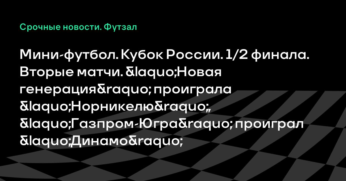 Состоялись вторые матчи Кубка России по мини-футболу. «Новая генерация» уступила «Норильскому никелю» (2:3), «Газпром-Югра» проиграл «Динамо» (1:2).
