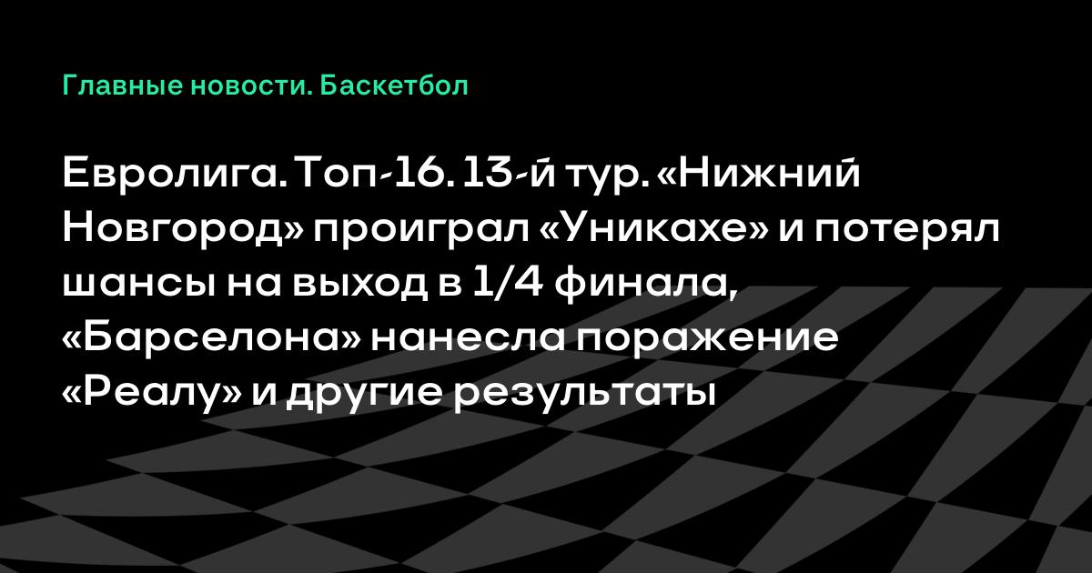 Евролига. Топ-16. 13-й тур. «Нижний Новгород» проиграл «Уникахе» и потерял шансы на выход в 1/4 финала, «Барселона» нанесла поражение «Реалу» и другие результаты