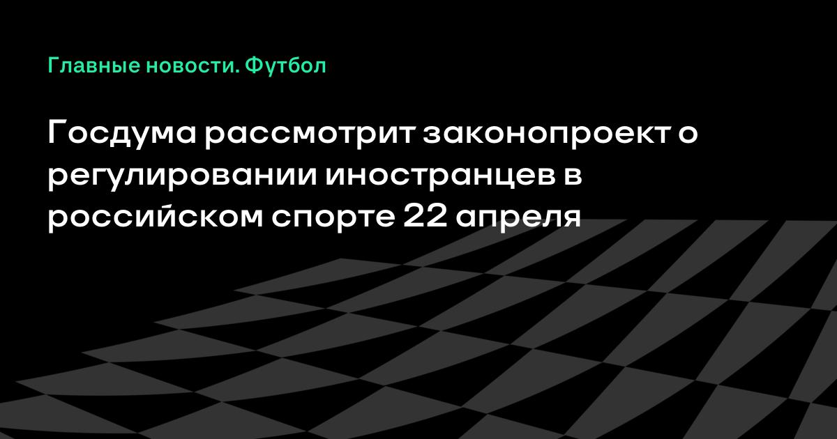 Государственная Дума РФ рассмотрит законопроект о регулировании иностранцев в отечественном спорте 22 апреля, сообщает «Р-Спорт» со ссылкой на главу комитета Госдумы по физкультуре, спорту и делам молодежи Игоря Ананских.Ранее министерство спорта страны получило положительное заключение правого управления президента РФ на представление этого законопроекта в Госдуму.