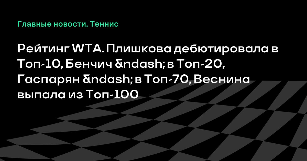Рейтинг WTA. Плишкова дебютировала в Топ-10, Бенчич – в Топ-20, Гаспарян – в Топ-70, Веснина выпала из Топ-100