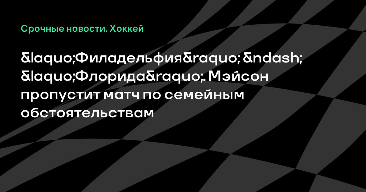 Голкипер «Филадельфии» Стив Мэйсон не сыграет в матче регулярного чемпионата НХЛ против «Флориды» из-за семейных обстоятельств, сообщил генменеджер «летчиков» Рон Хекстолл, воздержавшись от подробностей ситуации.