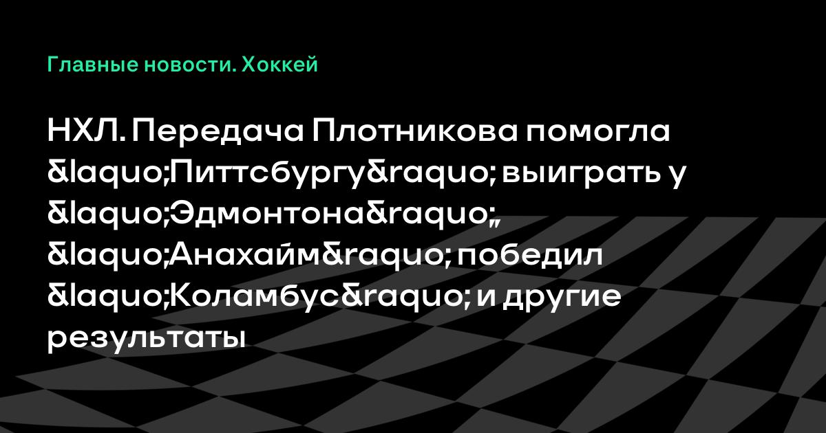 НХЛ. Передача Плотникова помогла «Питтсбургу» выиграть у «Эдмонтона», «Анахайм» победил «Коламбус» и другие результаты