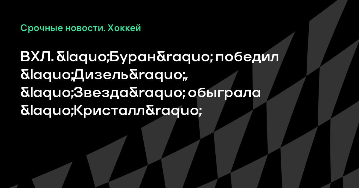 11 ноября 2015, 21:40 ВХЛ. «Буран» победил «Дизель», «Звезда» обыграла «Кристалл» В чемпионате ВХЛ сегодня прошло 2 матча. ВХЛ Регулярный чемпионат Буран – Дизель – 4:2 (1:0, 2:0, 1:2) Звезда – Кристалл – 5:2 (0:0, 4:1, 1:1) ПРИМЕЧАНИЕ: время начала матча – московское Хоккей Дизель Кристалл Саратов результаты матчей ВХЛ Буран Звезда Москва