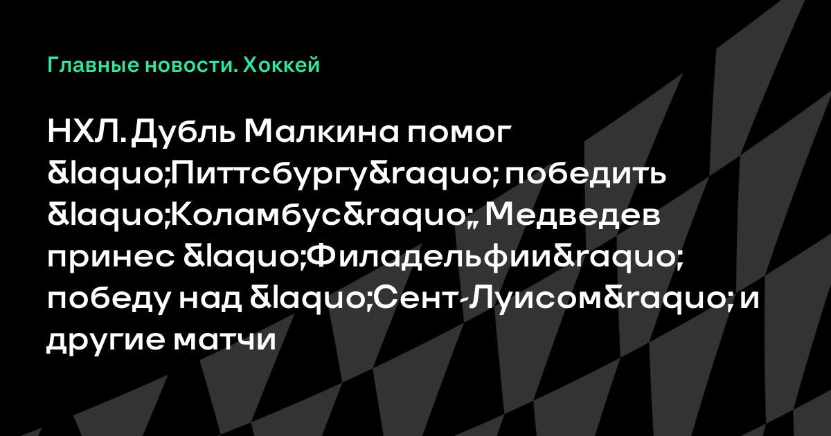 НХЛ. Дубль Малкина помог «Питтсбургу» победить «Коламбус», Медведев принес «Филадельфии» победу над «Сент-Луисом» и другие матчи