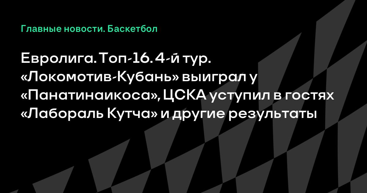 Евролига. Топ-16. 4-й тур. «Локомотив-Кубань» выиграл у «Панатинаикоса», ЦСКА уступил в гостях «Лабораль Кутча» и другие результаты