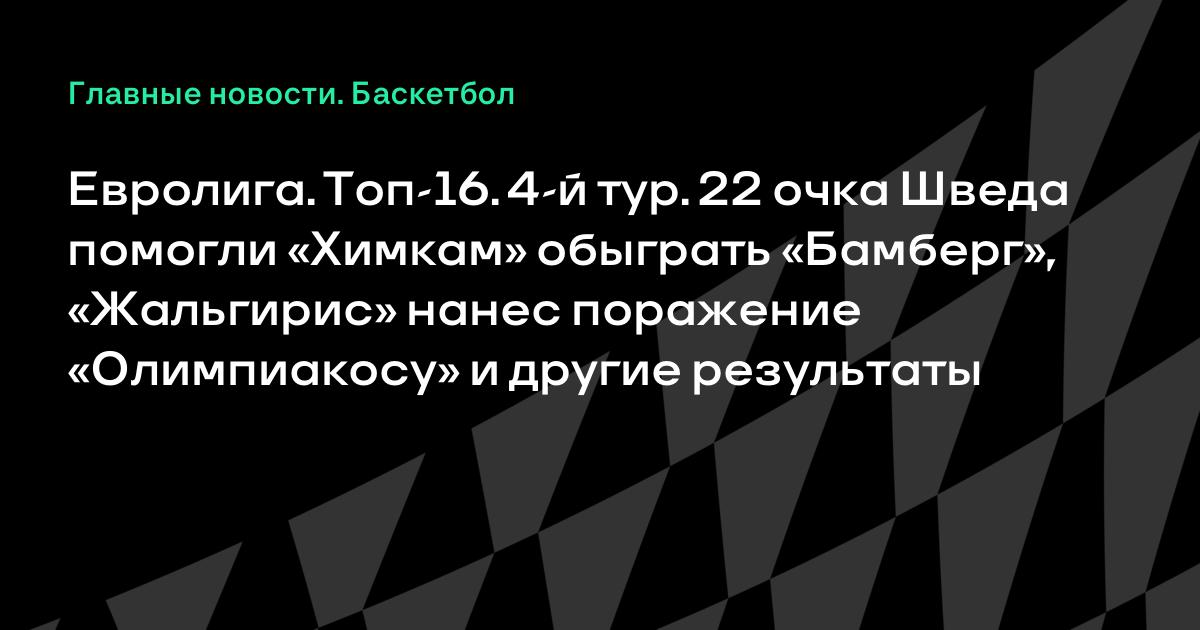 Евролига. Топ-16. 4-й тур. 22 очка Шведа помогли «Химкам» обыграть «Бамберг», «Жальгирис» нанес поражение «Олимпиакосу» и другие результаты