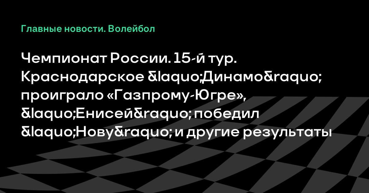 Сегодня завершился 15-й тур мужского чемпионата России по волейболу. Краснодарское «Динамо» проиграло «Газпрому-Югре» (0-3), «Енисей» победил «Нову» (3-2).