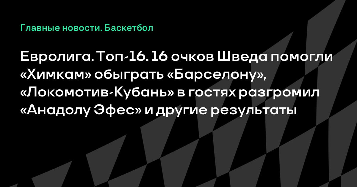 Евролига. Топ-16. 16 очков Шведа помогли «Химкам» обыграть «Барселону», «Локомотив-Кубань» в гостях разгромил «Анадолу Эфес» и другие результаты