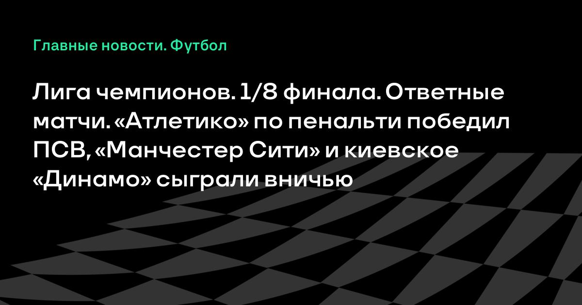 Лига чемпионов. 1/8 финала. Ответные матчи. «Атлетико» по пенальти победил ПСВ, «Манчестер Сити» и киевское «Динамо» сыграли вничью