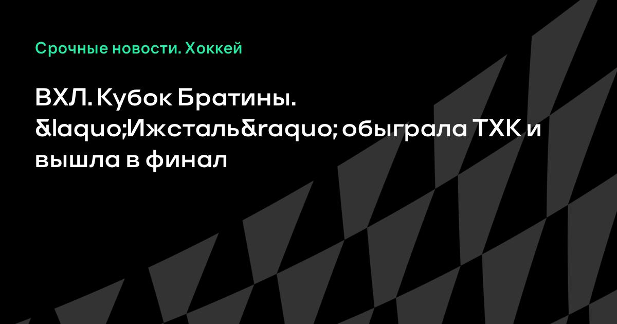 7 апреля 2016, 20:20 ВХЛ. Кубок Братины. «Ижсталь» обыграла ТХК и вышла в финал ВХЛ Кубок Братины 1/2 финала Ижсталь – ТХК – 2:0 (0:0, 0:0, 2:0) Счет в серии: 4-2. ПРИМЕЧАНИЕ: время начала матча – московское. Хоккей Ижсталь результаты матчей ТХК ВХЛ Кубок Петрова