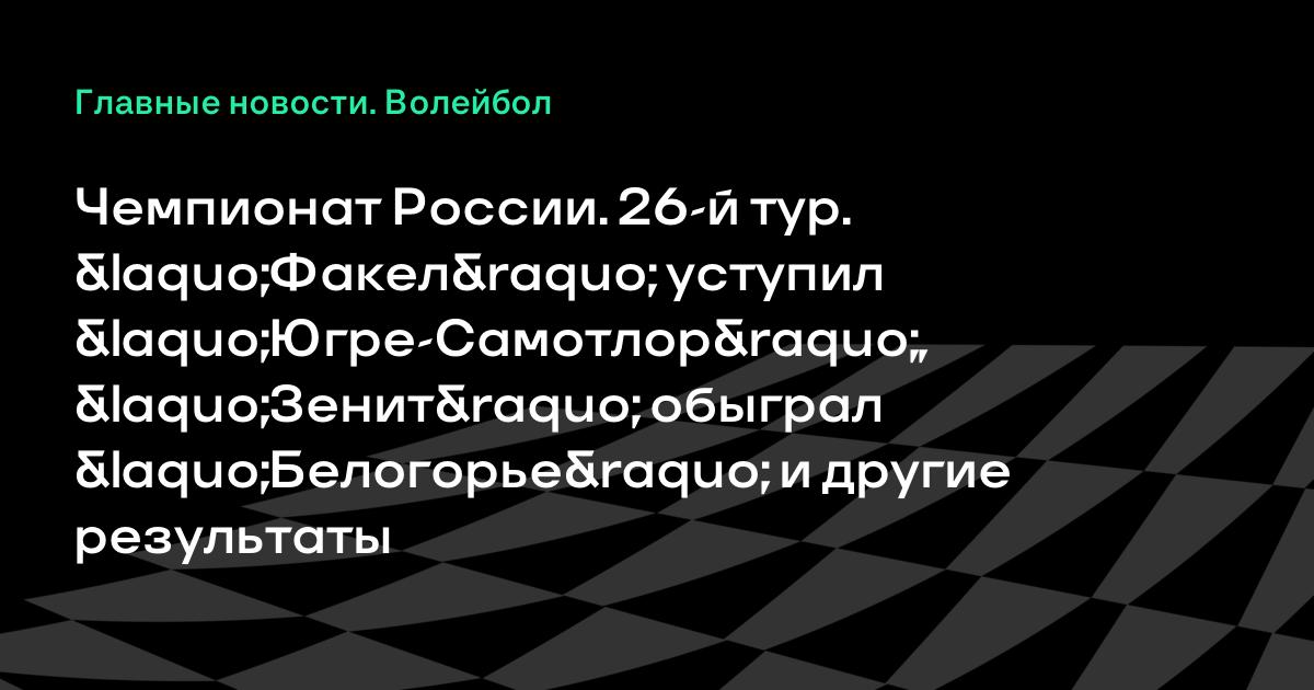Сегодня прошли матчи заключительного 26-го тура мужского чемпионата России по волейболу. «Факел» уступил «Югре-Самотлор» (0:3), «Зенит» обыграл «Белогорье» (3:0).