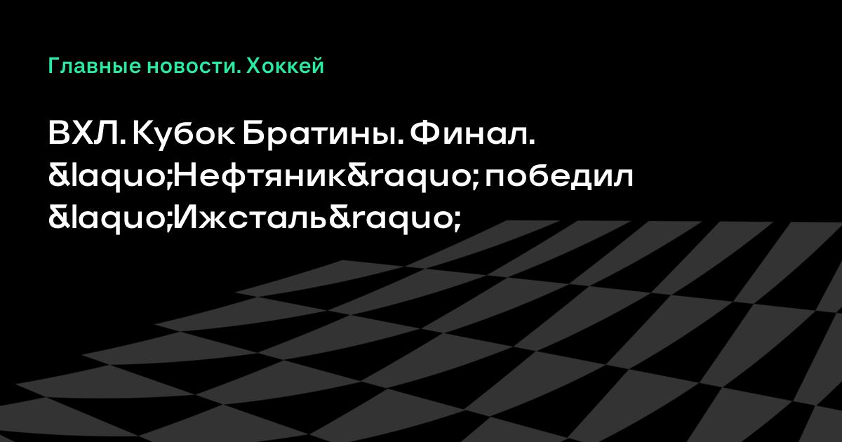 13 апреля 2016, 21:40 ВХЛ. Кубок Братины. Финал. «Нефтяник» победил «Ижсталь» Сегодня в ВХЛ стартовала финальная серия Кубка Братины. ВХЛ Кубок Братины Финал Нефтяник – Ижсталь – 4:1 (0:1, 3:0, 1:0) Счет в серии: 1-0. ПРИМЕЧАНИЕ: время начала матча – московское. Хоккей Ижсталь Нефтяник Альметьевск результаты матчей ВХЛ Кубок Петрова