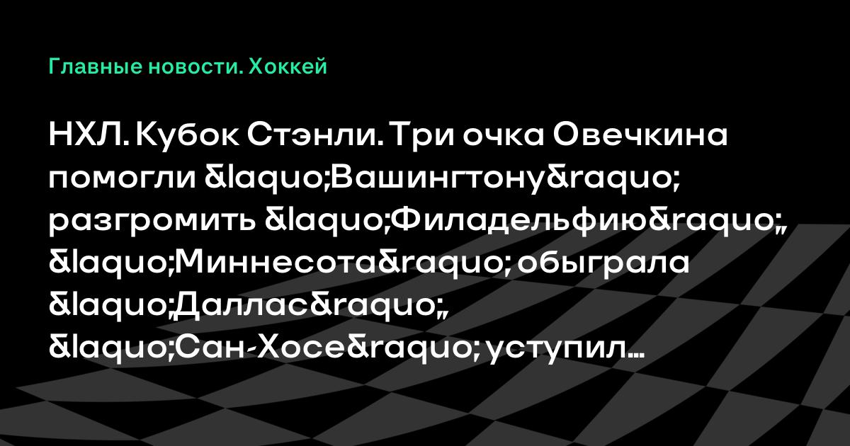 НХЛ. Кубок Стэнли. Три очка Овечкина помогли «Вашингтону» разгромить «Филадельфию», «Миннесота» обыграла «Даллас», «Сан-Хосе» уступил «Лос-Анджелесу»