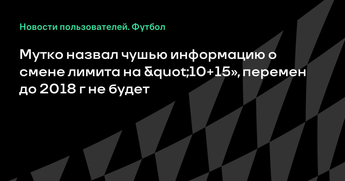 Министр спорта и президент Российского футбольного союза Виталий Мутко заявил, что информация об обсуждении смены лимита на легионеров в российском футболе на формат "10+15» — это полная чушь, все изменения будут рассматриваться после 2018 года. В прошлом сезоне чемпионата России по футболу действовал лимит по схеме "6 легионеров + 5 россиян на поле». Ранее СМИ сообщали, что на ближайшем исполкоме РФС 23 июля будет рассмотрено предложение о замене действующего лимита на новый по схеме "10 россиян + 15 легионеров в заявке». «Люди поднимают себе тиражи. РФС такое не рассматривал и не рассматривает. Это чушь полная! Что, мы каждый день будем менять правила что ли? Никто не собирается (пока этого делать). Мы же говорили — после 2018 года посмотрим», — заявил Мутко.
