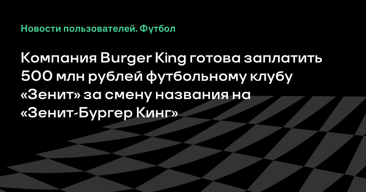 Компания Burger King готова заплатить 500 млн рублей футбольному клубу «Зенит» за смену названия на «Зенит-Бургер Кинг»
