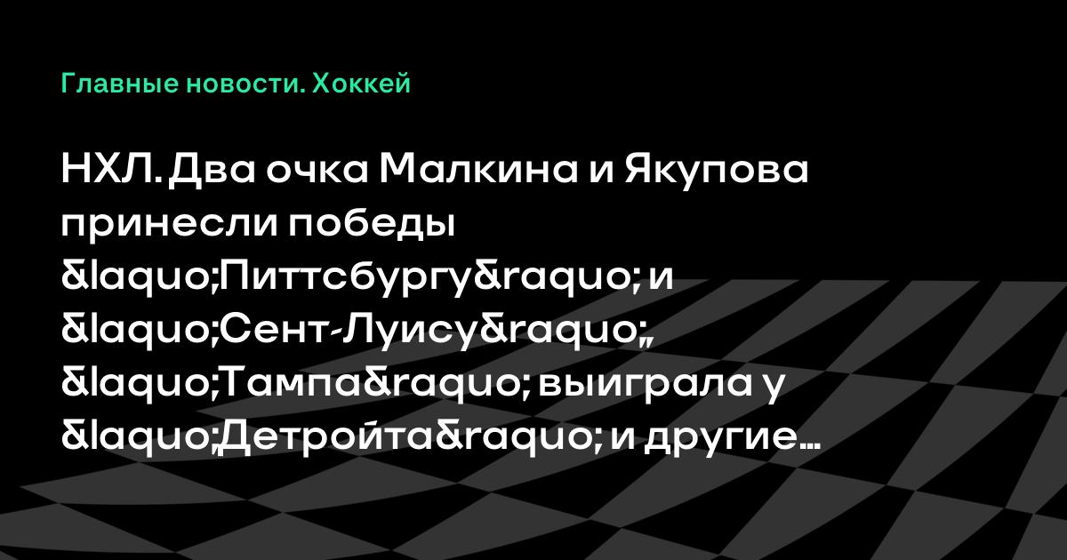 НХЛ. Два очка Малкина и Якупова принесли победы «Питтсбургу» и «Сент-Луису», «Тампа» выиграла у «Детройта» и другие результаты