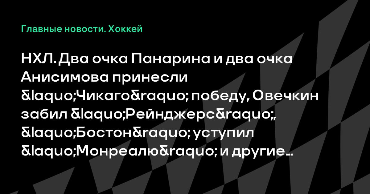 НХЛ. Два очка Панарина и два очка Анисимова принесли «Чикаго» победу, Овечкин забил «Рейнджерс», «Бостон» уступил «Монреалю» и другие результаты