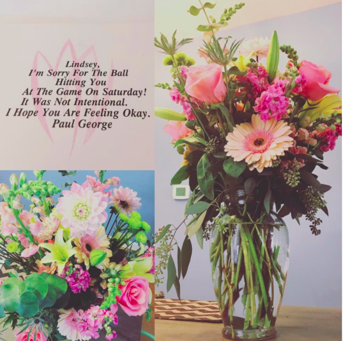 Форвард «Индианы» Пол Джордж отправил цветы болельщице, которая пострадала по его вине во время матча с «Чикаго». Напомним, что игрок пнул мяч и случайно попал в лицо девушке, после чего подошел к ней и извинился.