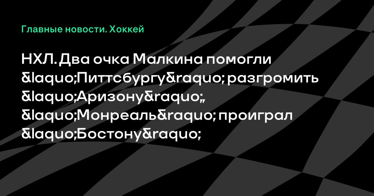НХЛ. Два очка Малкина помогли «Питтсбургу» разгромить «Аризону», «Монреаль» проиграл «Бостону»