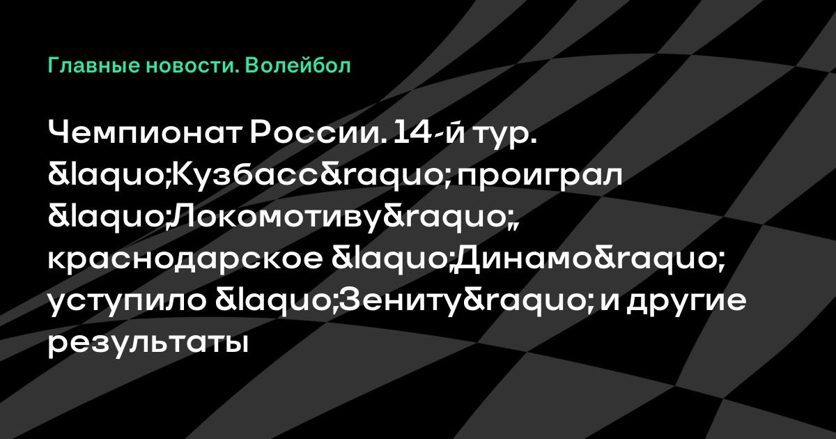 Сегодня прошли матчи 14-го тура мужского чемпионата России по волейболу. «Кузбасс» проиграл «Локомотиву», краснодарское «Динамо» уступило «Зениту».