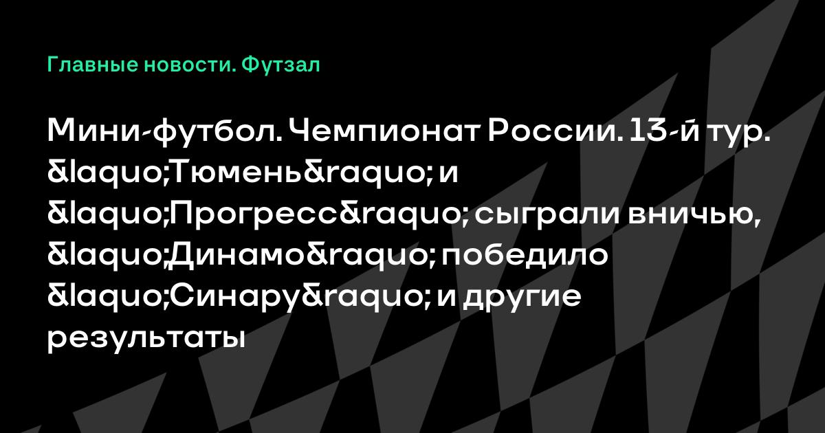 Сегодня завершился 13-й тур чемпионата России по мини-футболу. «Тюмень» и «Прогресс» сыграли вничью (2:2), «Динамо» победило «Синару» (10:2).