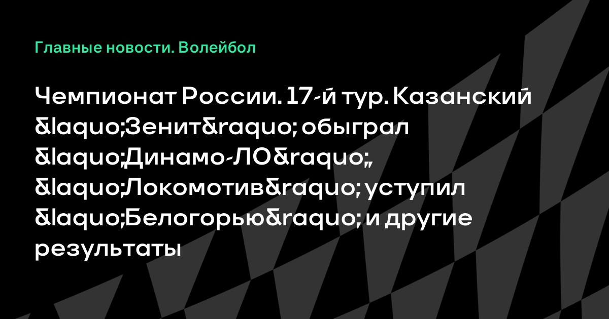 Сегодня прошли матчи 17-го тура мужского чемпионата России по волейболу. Казанский «Зенит» выиграл у «Динамо-ЛО» (3-0), «Локомотив» уступил «Белогорью» (0-3).
