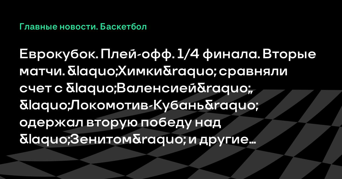 Еврокубок. Плей-офф. 1/4 финала. Вторые матчи. «Химки» сравняли счет с «Валенсией», «Локомотив-Кубань» одержал вторую победу над «Зенитом» и другие результаты