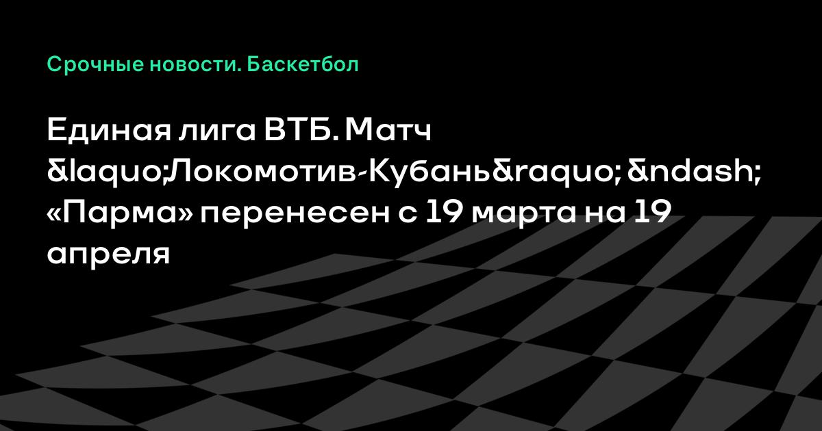 Матч регулярного чемпионата Единой лиги ВТБ «Локомотив-Кубань» – «Парма» перенесен с 19 марта на 19 апреля, сообщает официальный сайт краснодарцев.