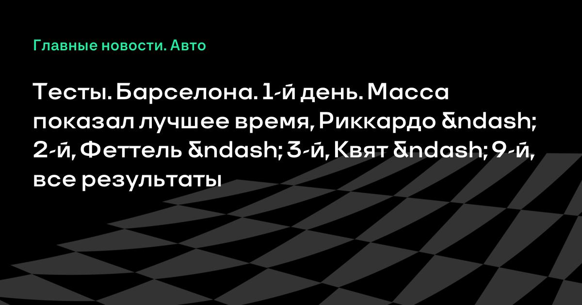 Тесты. Барселона. 1-й день. Масса показал лучшее время, Риккардо – 2-й, Феттель – 3-й, Квят – 9-й, все результаты