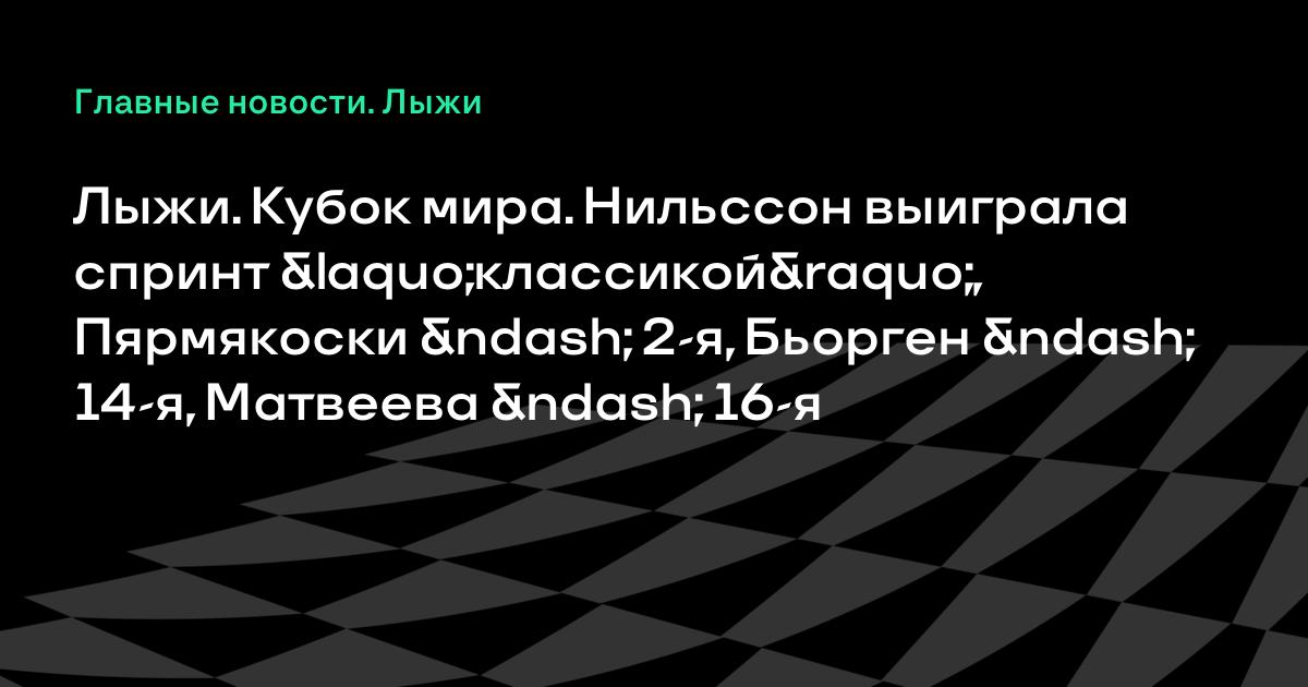 Лыжи. Кубок мира. Нильссон выиграла спринт «классикой», Пярмякоски – 2-я, Бьорген – 14-я, Матвеева – 16-я