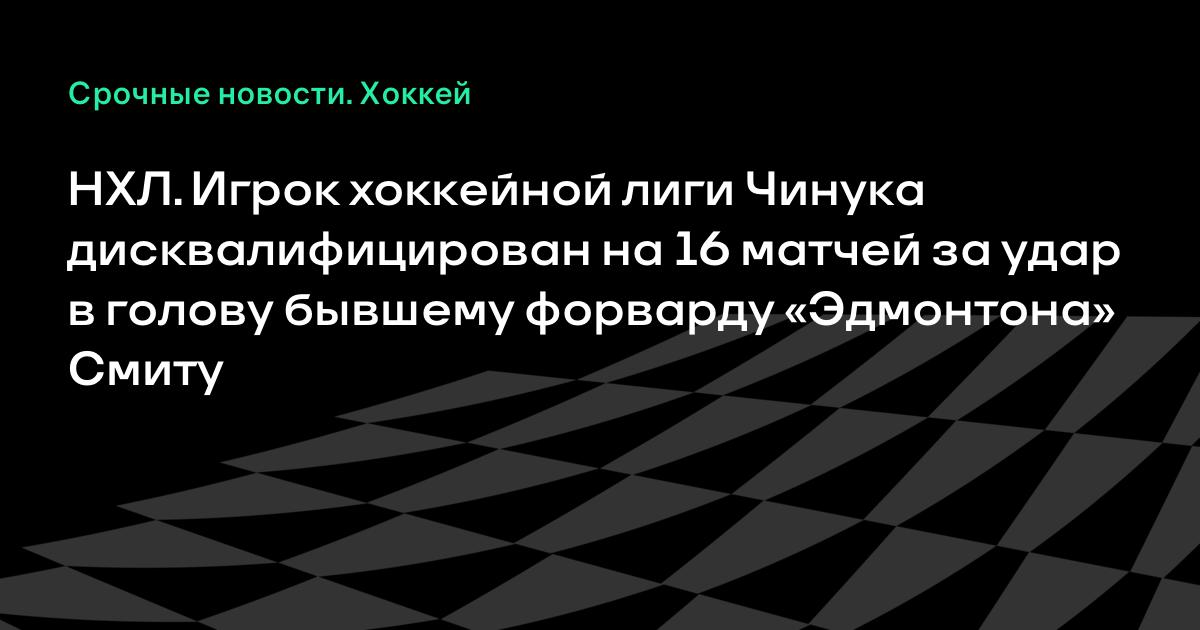 НХЛ. Игрок хоккейной лиги Чинука дисквалифицирован на 16 матчей за удар в голову бывшему форварду «Эдмонтона» Смиту