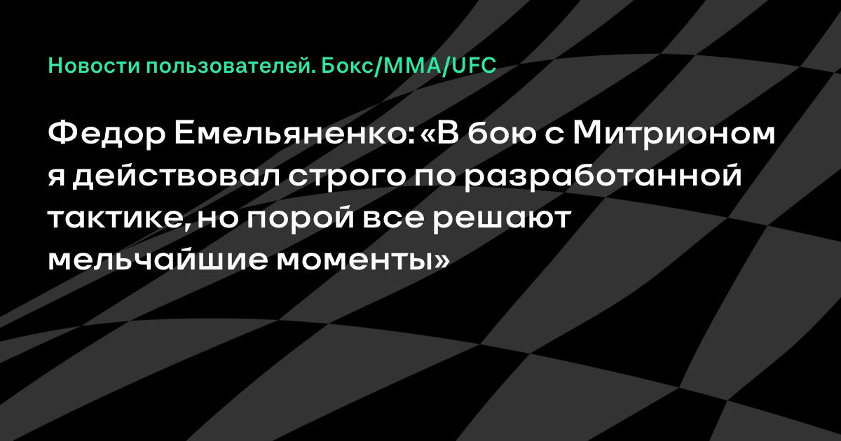 — Я действовал строго по разработанной тактике, четко придерживался своего плана на поединок. У нас с Митрионом произошла обоюдная атака, в результате мы оба одновременно отправились в нокдаун. Он оправился на доли секунды быстрее меня. Именно этого времени и хватило для определения исхода поединка. Порой всё решают мельчайшие моменты. Так произошло и в этот раз, — цитируют Емельяненко «Известия».