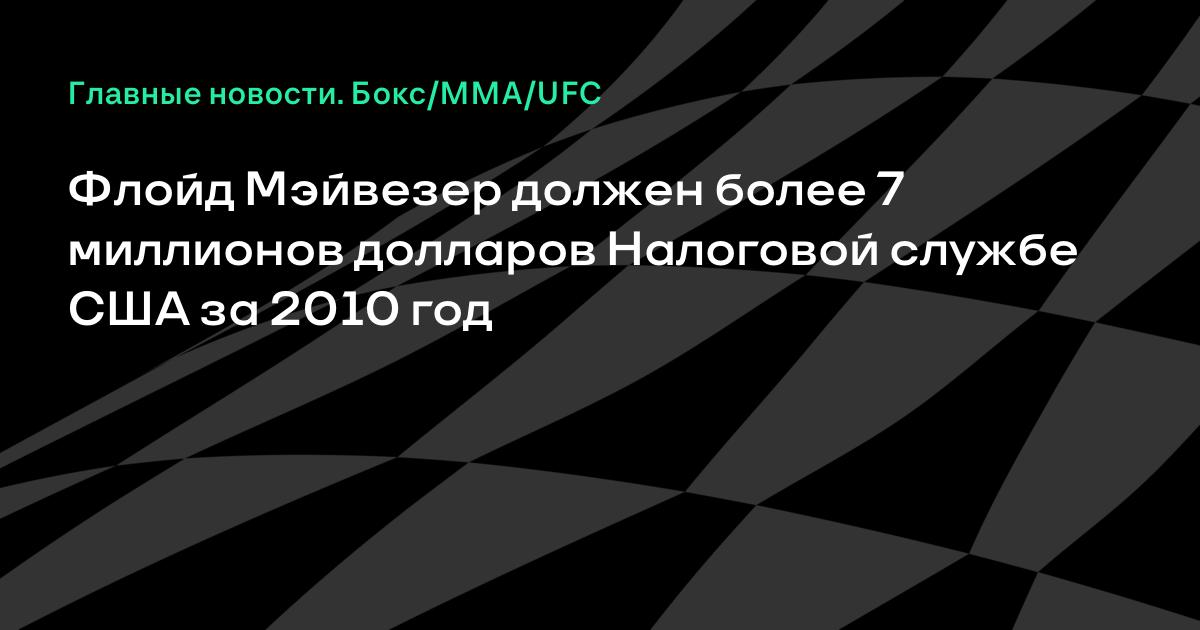 Ранее стало известно, что за 2015 год Флойд также имеет задолженность перед налоговыми органами в размере 22,2 миллионов долларов. Издание Forbes сообщало, что Мэйвезер обратился в налоговые органы с просьбой перенести дату платежа – боксер был намерен погасить долг в августе после поединка с чемпионом UFC Конором Макгрегором. Позднее стало известно, что Налоговая служба США отказала Мэйвезеру в этой просьбе.