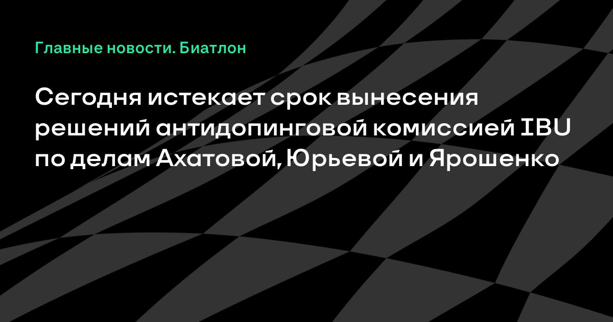Пресс-атташе Союза биатлонистов России (СБР) Дмитрий Лоев в разговоре с корреспондентом Sports.ru Александром Черновым сообщил, что сегодня, 28 мая, истекает срок вынесения решений антидопинговой комиссией Международного союза биатлонистов (IBU) по делам Альбины Ахатовой, Екатерины Юрьевой и Дмитрия Ярошенко.