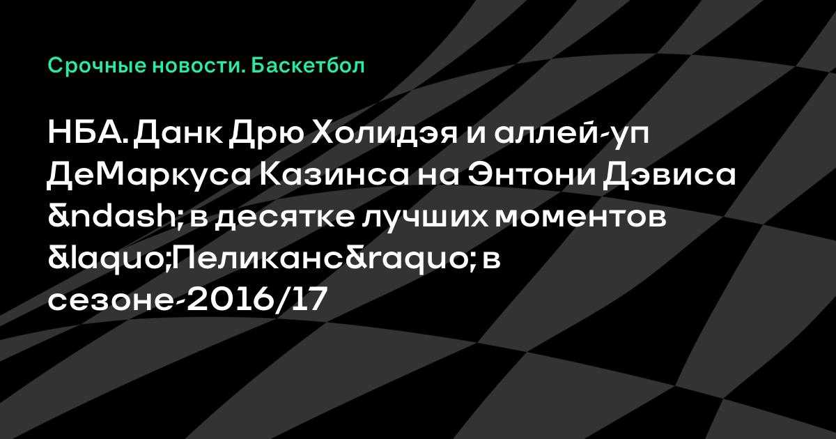 27 июля 2017, 07:55 НБА. Данк Дрю Холидэя и аллей-уп ДеМаркуса Казинса на Энтони Дэвиса – в десятке лучших моментов «Пеликанс» в сезоне-2016/17 Данк Дрю Холидэя и аллей-уп ДеМаркуса Казинса на Энтони Дэвиса – в десятке лучших моментов «Пеликанс» в сезоне-2016/17. ВИДЕО Источник: YouTube Баскетбол Новый Орлеан НБА Баскетбол - видео Дрю Холидэй Демаркус Казинс Энтони Дэвис