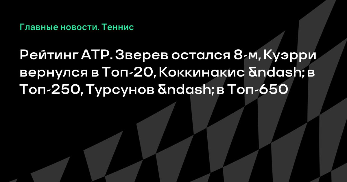 Рейтинг ATP. Зверев остался 8-м, Куэрри вернулся в Топ-20, Коккинакис – в Топ-250, Турсунов – в Топ-650
