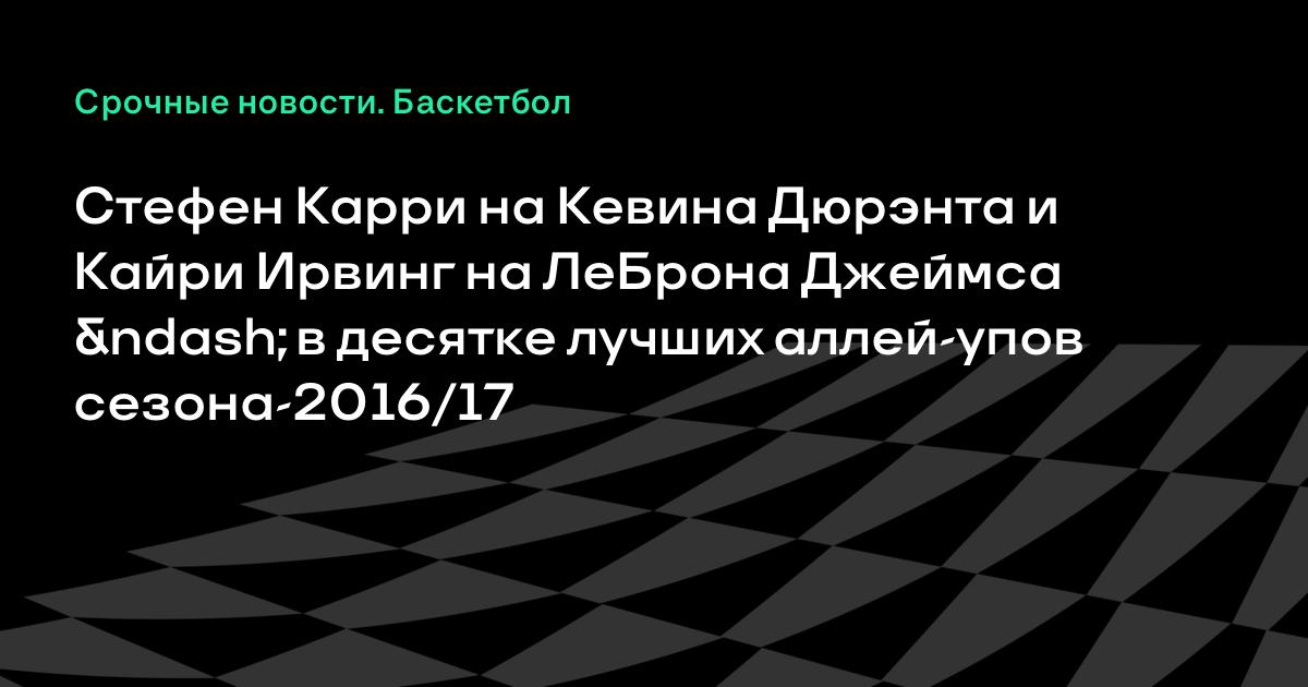 13 августа 2017, 10:56 Стефен Карри на Кевина Дюрэнта и Кайри Ирвинг на ЛеБрона Джеймса – в десятке лучших аллей-упов сезона-2016/17 Стефен Карри на Кевина Дюрэнта и Кайри Ирвинг на ЛеБрона Джеймса – в десятке лучших аллей-упов сезона-2016/17. ВИДЕО Источник: YouTube Баскетбол НБА Баскетбол - видео
