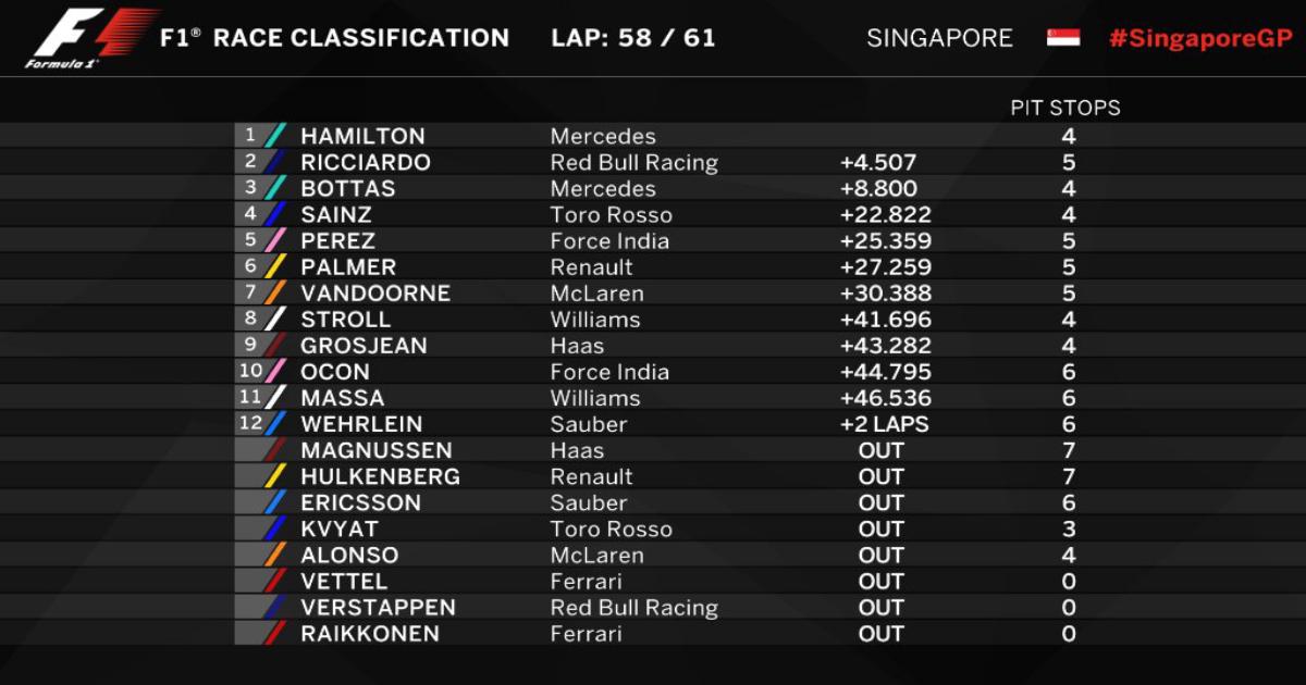 Гран-при Сингапура. Хэмилтон – первый, Риккардо – второй, Боттас – третий, гонщики «Феррари» столкнулись на старте