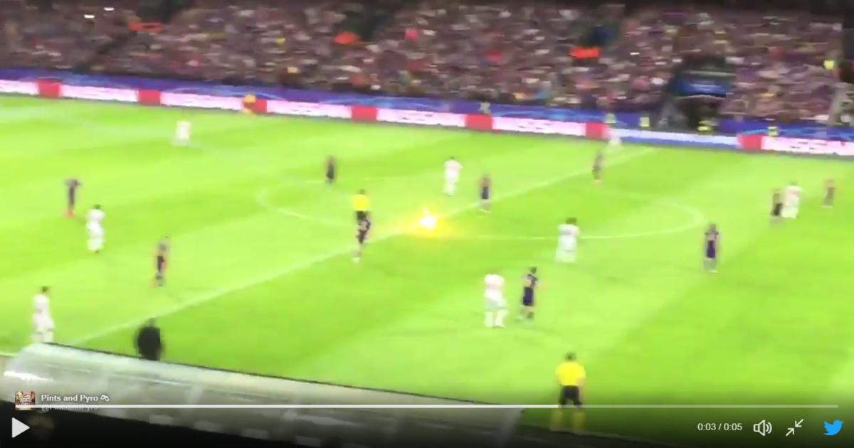По ходу встречи на фан-секторе «Спартака» зажгли файеры, один из них полетел на поле и чуть не задел Айтекина.