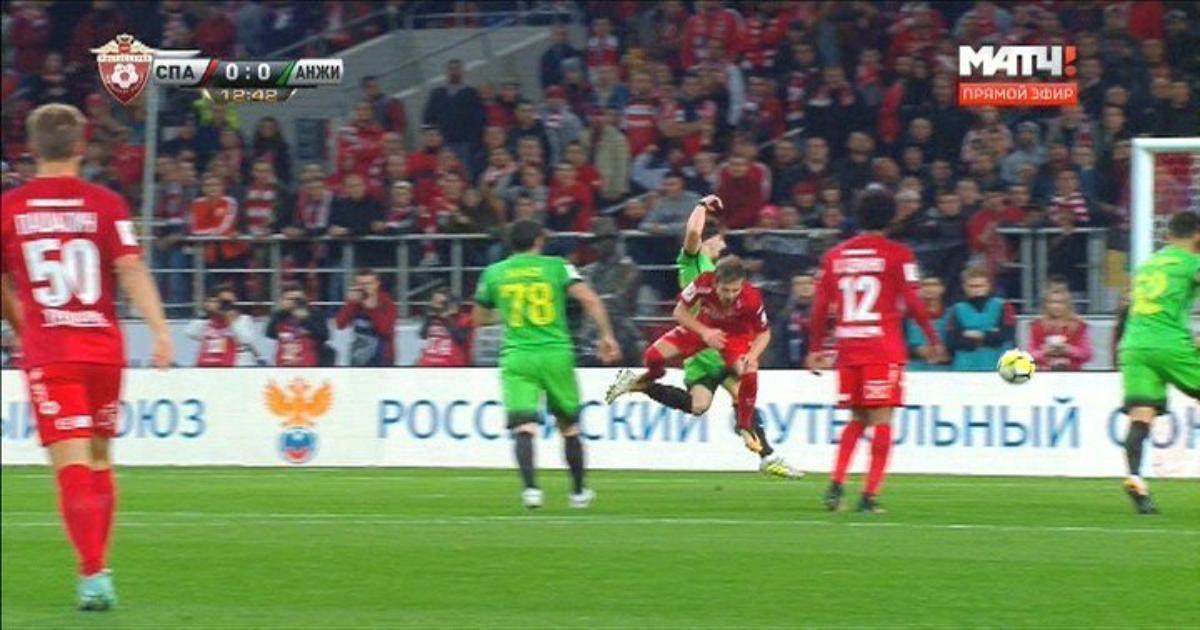 Арбитр Виталий Мешков назначил пенальти, посчитав, что полузащитник «Анжи» Павел Яковлев сфолил на хавбеке «Спартака» Жано Ананидзе.