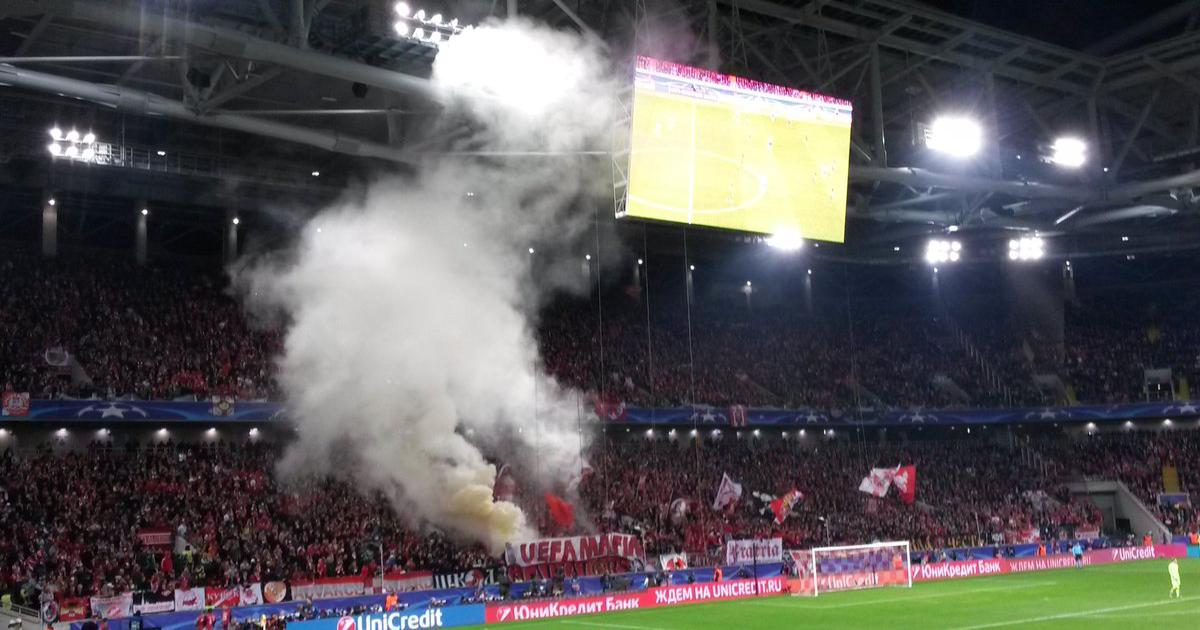 Болельщики московской команды зажгли пиротехнику и продемонстрировали за воротами баннер «UEFA MAFIA».