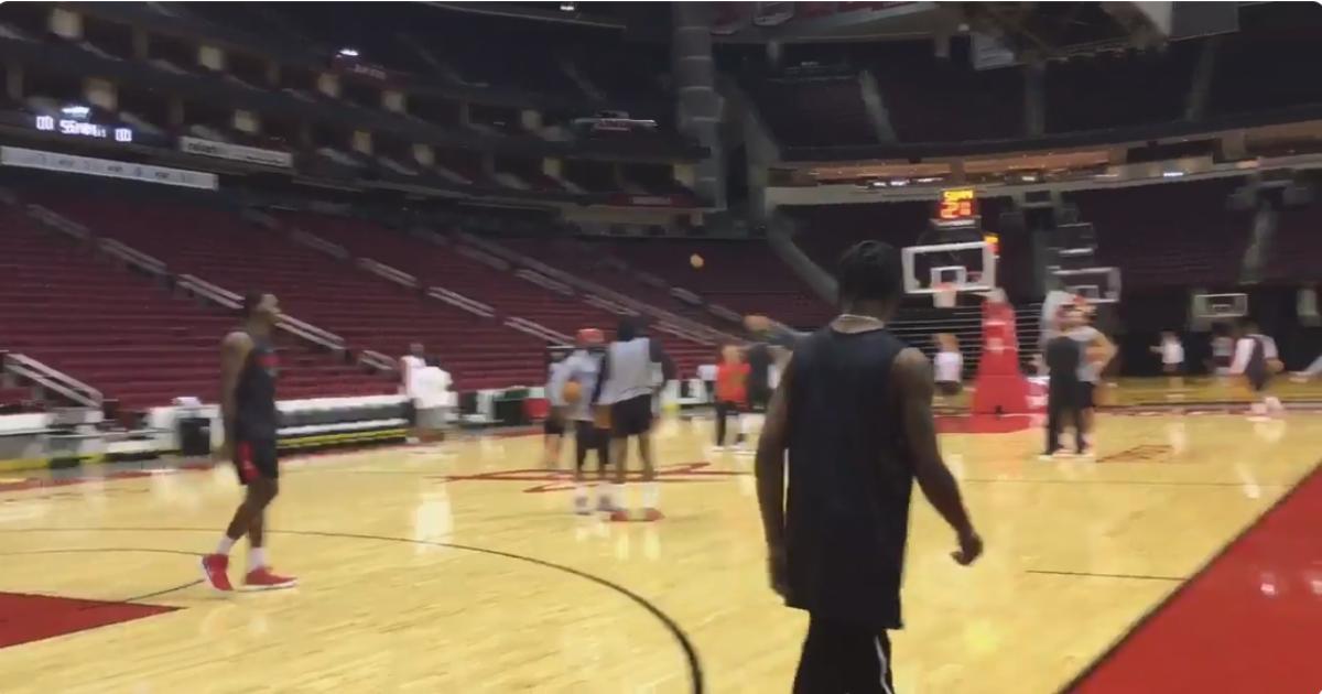 Рэпер Трэвис Скотт, который является болельщиком «Хьюстона», в понедельник побывал на тренировке техасской команды и побросал по кольцу.