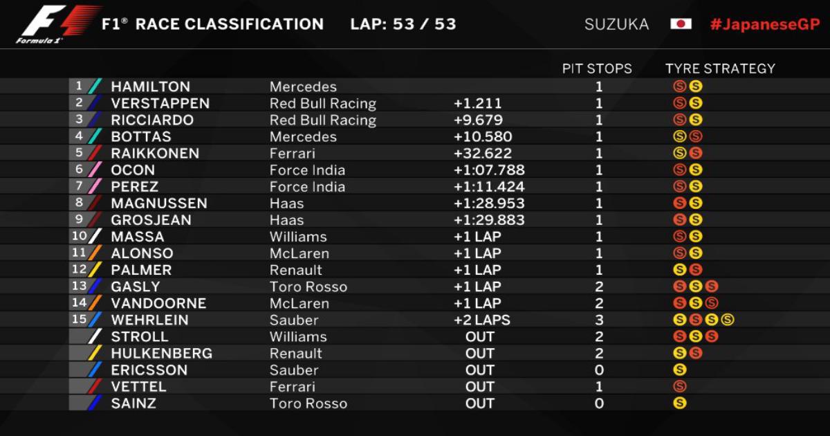 Гран-при Японии. Хэмилтон выиграл гонку, Ферстаппен – второй, Риккардо – третий, Феттель сошел