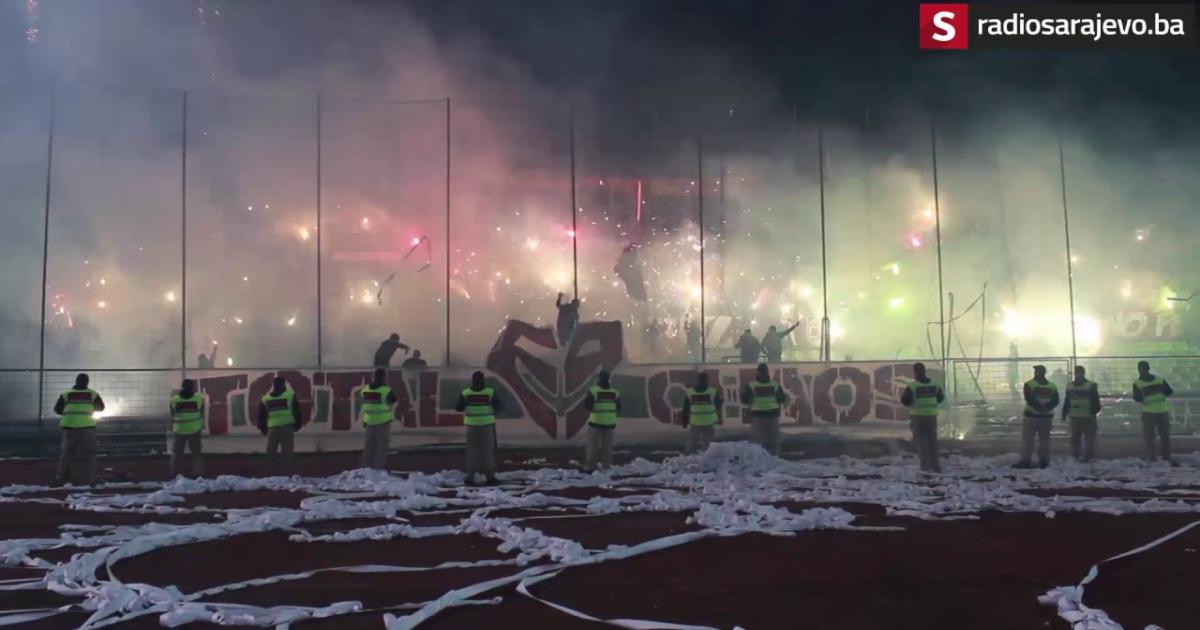 В первом тайме с трибуны боснийских болельщиков на поле были выброшены десятки файеров.