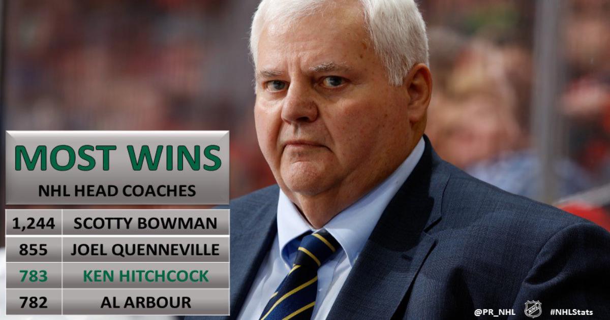 Ken Hitchcock earned his 783rd career regular-season win to pass Al Arbour (782) for third on the NHL’s all-time list among head coaches. pic.twitter.com/y9M9cLG8Zh